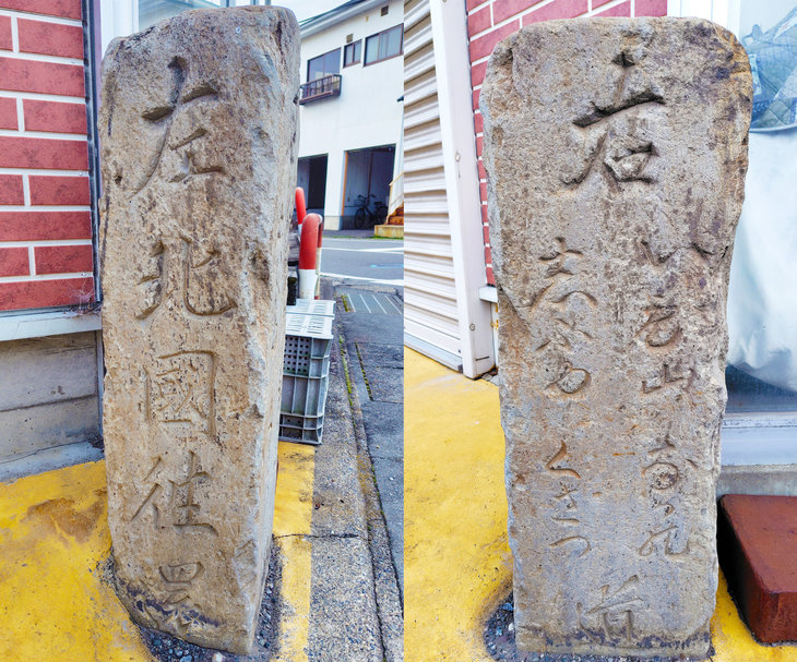 ところがある日、近所のスーパーに歩いて出かけ、信号のない三叉路で車が通り過ぎるのを待っていたとき、ふと案内板と石柱が目に入りました。