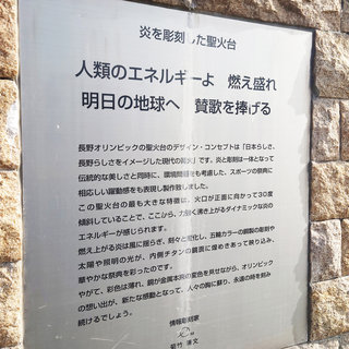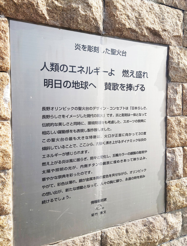 この聖火台には、作者である情報彫刻家・菊竹清文(きくたけきよゆき)氏の、大会後の「未来」を見据えたメッセージプレートがはめ込まれています。