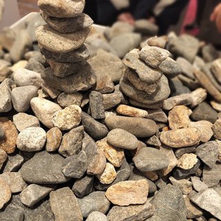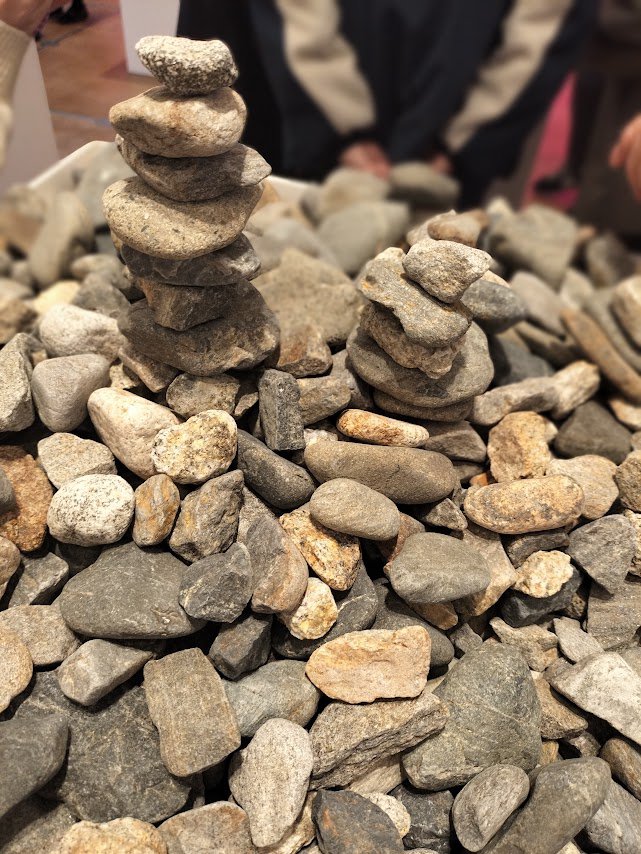 ■ 「#川原にて」(佐々木隼 氏) 本物の石が置かれており、石積みそのものを楽しむ作品です。作品説明には、こんなメッセージが添えられていました。 『人は石を前にすると、高く積みたくなってしまう。(中略)石を積む行為は、地獄の寓話「賽の河原」の罰として描かれているが、実は試行錯誤を繰り返す楽しい遊びだったかもしれない。同じ行為を地獄と見るか、遊びと見るか。その境界線は世界の側ではなく、私たち自身の内側にある。』 なるほど。。長野からわざわざ東京へ来て石積みをしたことで、地元の千曲川の河原の石では得られないような新しい視点に気づかされ、ハッとさせられました。