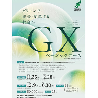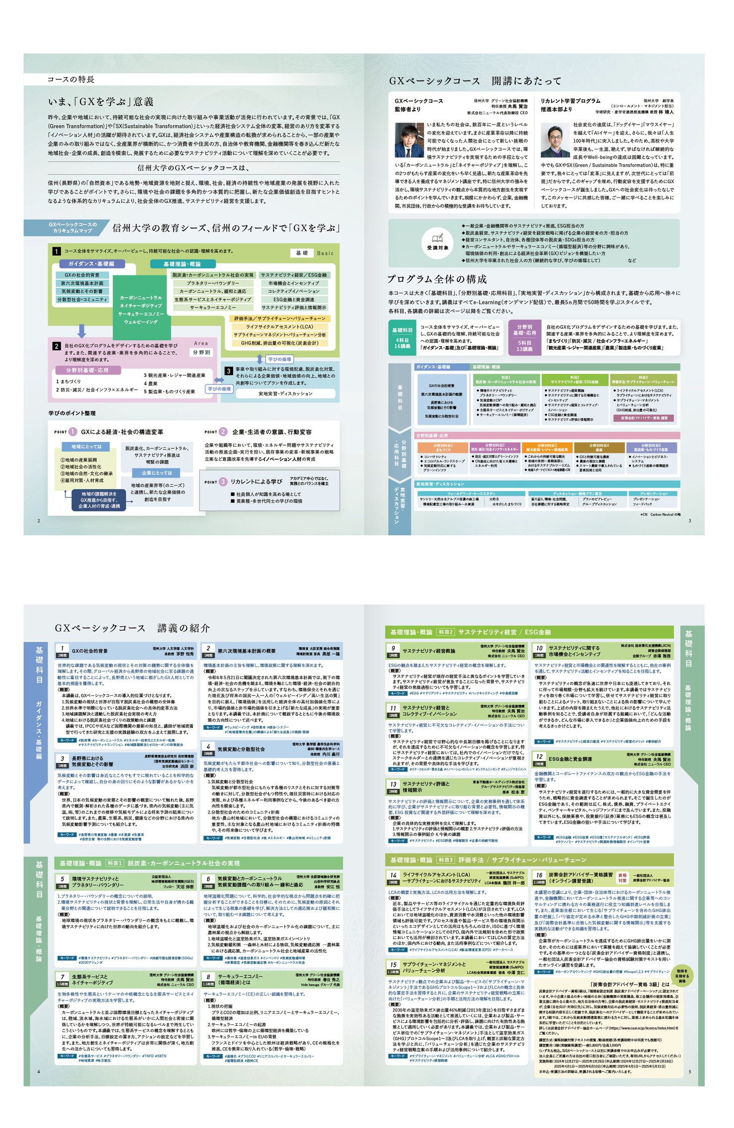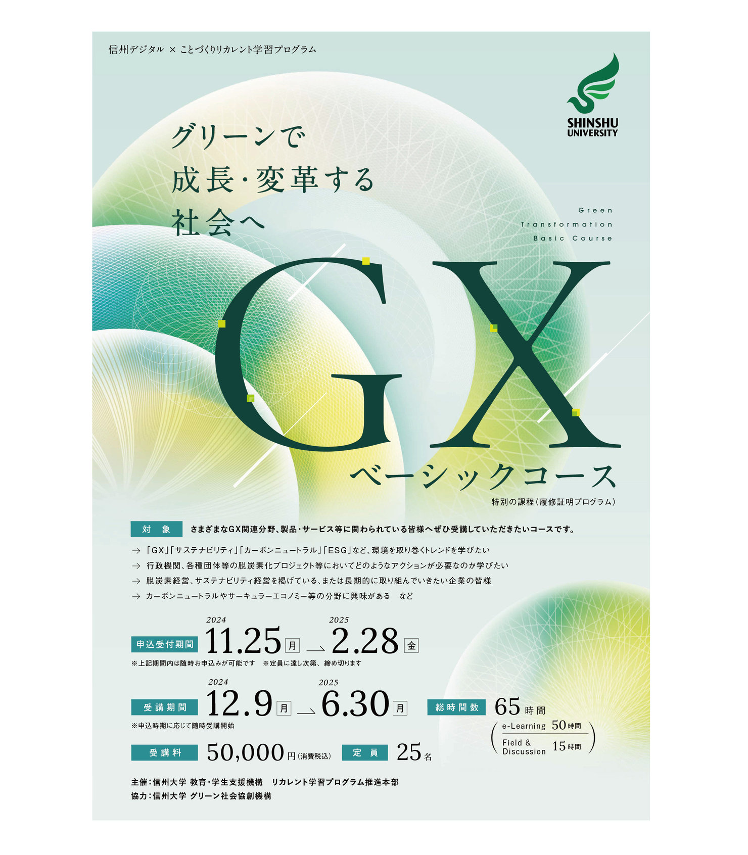 信州大学リカレント学習プログラム推進本部様主催のGX(グリーントランスフォーメーション)学習コースの案内パンフレットです。表紙デザインは循環とエコシステム、グローバルネットワークを意識し、個々の知が繋がり合い、変革の動力となって推進する様子をギミック的に表現しています。